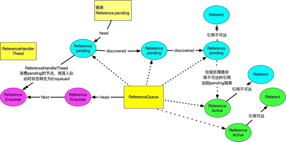 - Pending:待处理引用列表的一个元素,等待被引用处理线程加入到ReferenceQueue。 未注册的实例永远不会处于这种状态。