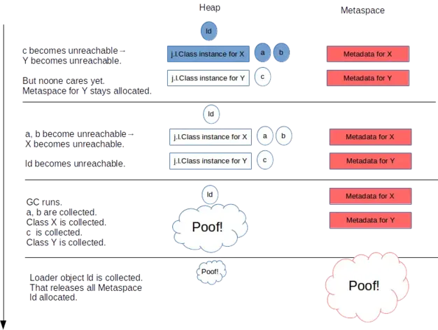 - 但是,如果这些块由不同的类加载器拥有,它们的生命周期不同,那么什么都不会被释放。当我们处理许多小型类加载器(例如,匿名类的加载器或反射委托器)时,可能会出现这种情况。