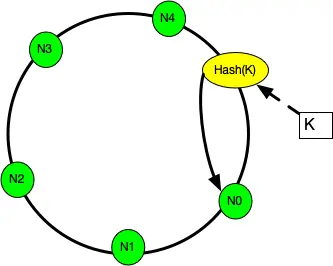 2. 将所有槽位(或者节点) N0,..,Nn−1的标号 0,…,n−1依次作为 hash函数的输入(一般情况下对机器的hash计算是采用机器的IP或者机器唯一的别名作为输入值)进行哈希, 把结果分别标记在环上。