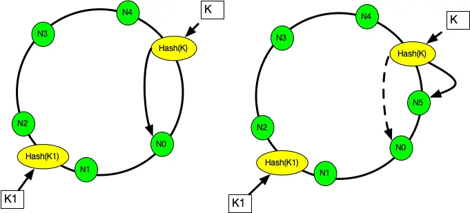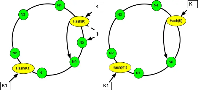 当往一个哈希环中新增一个槽位时,如下图, N5是新增的槽位。 可以看到 k从 N0重新映射到了 N5, 而 k1的映射结果不变。 稍加分析可以知道, 只有被新增槽位拦下来的 k的映射结果是变化了的。 新增槽位拦截了原本到下一节点的部分映射,其他槽位不受影响。顺时针方向的下一个节点 N0需要迁移部分数据到新节点N5上才可以正常服务, 其他节点不受影响。