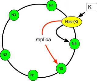 • 数据备份(双写): 数据写入到某个节点时,同时写一个备份(replica)到顺时针的邻居节点。