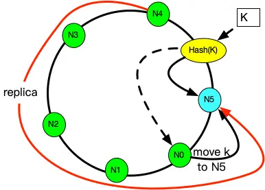 1. 移除节点的情况: 每一个节点在执行写请求时,都会写一个备份到顺时针的邻居节点。 这样,当 N5节点因故障需要踢除时,新的请求会交接给它的邻居节点 N0, N0上有 k的备份数据,可以正常读到。