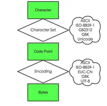 - Bytes 二进制字节。其含义为代码点在内存或磁盘中的表示形式。代码点与二进制字节的一一对应关系称为编码(Encoding),当然这种对应关系也不是唯一的,所以编码也有很多种,像 ASCII、ISO-8859-1、ENC-CN、GBK、UTF-8等。