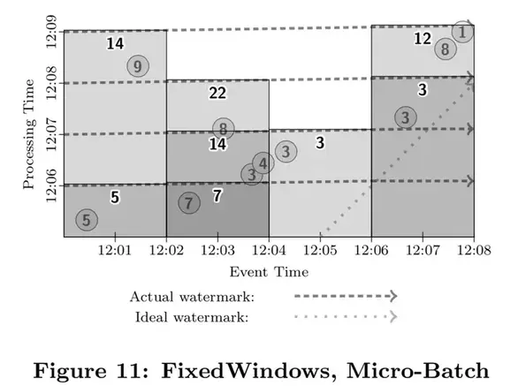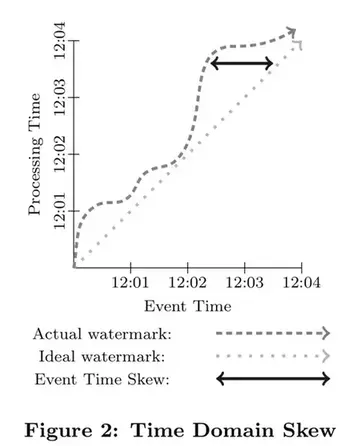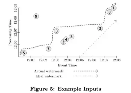 在数据处理过程中,由于系统本身的一些现实影响(通信延迟,调度算法,处理时长,管道中间数据序列化等)会导致这两个时间存在差值且动态波动(见图2)。使用记录全局数据处理进度的标记、或水位线,是一种很好的方式来可视化这个差值。在本论文中,我们采用一种类似MillWheel的水位线,它是一个时间戳,代表小于这个时间戳的数据已经完全被系统处理了(通常用启发式方法建立)。