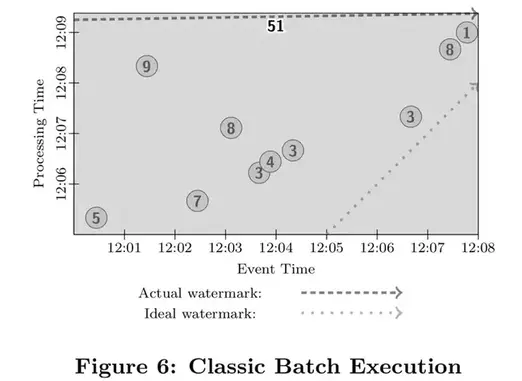 注意上图中包含了水位线。尽管在传统批处理系统中不存在水位线的概念,但是在语义上我们仍然可以引入它。批处理的水位线刚开始时一直停留不动。直到系统收到了所有数据并开始处理,水位线近似平行于事件发生时间轴开始平移,然后一直延伸到无穷远处。我们之所以讨论这一点,是因为如果让流处理引擎在收到所有数据之后启动来处理数据,那么水位线进展和传统批处理系统是一模一样的。