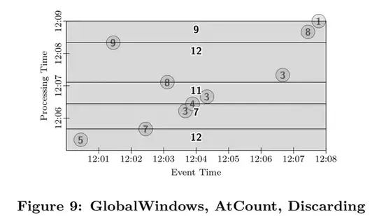 我们接下来考虑支持无边界数据源的其他选项,不再仅仅考虑全局窗口。一开始,我们来观察固定的2分钟窗口,累积窗格: