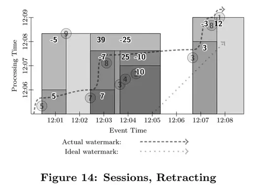 对大多数现实世界中分布式数据集,系统缺乏足够的信息来建立一个100%准确的水位线。举例来说,在视频观看“会话”的例子中,考虑离线观看。如果有人把他们的移动设备带到野外,系统根本没有办法知道他们何时会回到有网络连接的地带,然后开始上传他们在没有网络连接时观看视频的数据。因此,大多数的水位定义是基于有限的信息启发式地定义。对于带有未处理数据的元数据的结构化输入源,比如说日志文件,水位线的猜测明显要准确些,因此大多数情况下可以作为一个处理完成的估计。另外,很重要的一点,一旦水位线建立之后,它可以被传递到数据处理管道的下游(就像标记(Punctuation)那样)。当然下游要明确知道这个水位线仍然是一个猜测。