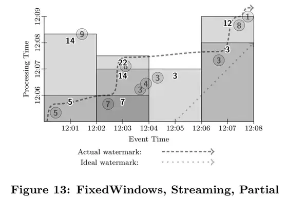 如果我们想降低整体的延迟,那么我们可以提供按数据处理时间的触发器进行周期性的触发,这样我们能够尽早得到窗口的计算结果,并且在随后得到周期性的更新,直到水位线越过窗口边界。参见图13。这样我们能够得到比微批次系统更低的延迟,因为数据一到达就进入了窗口随后就可能被触发,而不像在微批次系统里必须等待一个批次数据完全到达。假设微批次系统和流处理系统都是强一致的,那么我们选择哪种引擎,就是在能接受的延迟程度和计算成本之间的选择(对微批次系统也是批大小的选择)。这就是我们这个模型想要达到的目标之一。参见图13:固定窗口,流处理,部分窗格。