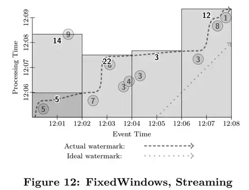 我们之前曾经说过,数据已经被完全处理的标记经常和数据的准确性是相互冲突的,因此,我们不会太过于依赖于水位线。不过,它确实是一种有用的手段。系统可以用它猜测所有事件发生时间早于水位线的数据已经完全被观察到。应用可以用它来可视化处理时间差,也用它来监控系统总体的健康状况和总体处理进展,也可以用它里做一些不影响数据准确性的决策,比如基本垃圾回收策略等。