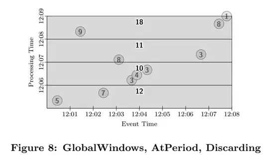 如果我们想要求出每分钟的和的增量,那么我们可以使用窗格的抛弃模式,如图8所示。注意这是很多流处理引擎的处理时间窗口的窗口计算模式。窗格不再相互重合,因此窗口的结果包含了相互独立的时间区域内的数据: