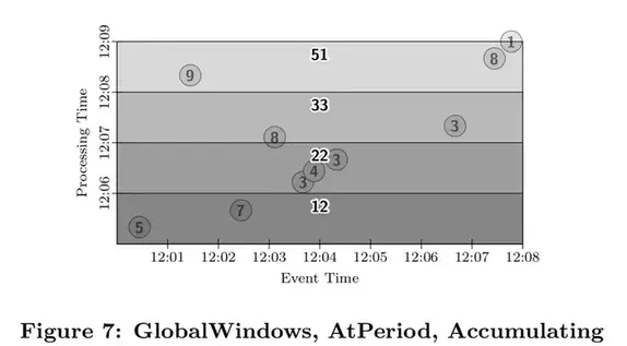 如果我们在传统的批处理系统中构建上述的对数据进行求和的数据处理管道,那么我们会等待所有的数据到达,然后聚合成一个批次(因为我们现在假设所有的数据拥有同样的键),再进行求和,得到了结果51。如图6所示黑色的长方形是这个运算的示意图。长方形的区域代表求和运算涵盖的处理时间和参与运算的数据的事件发生时间区间。长方形的上沿代表计算发生,获得结果的管道处理时间点。因为传统的批处理系统不关心数据的事件发生时间,所有的数据被涵盖在一个大的全局性窗口中,因此包含了所有事件发生时间内的数据。而且因为管道的输出在收到所有数据后只计算一次,因此这个输出包含了所有处理时间的数据。