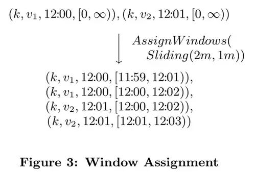 从模型角度来说,把一条数据分配给某几个窗口意味着把这条数据复制给了这些窗口。以图3为例,它是把两条记录分配给一个2分钟宽,每一分钟滑动一次的窗口。(简单起见,时间戳用HH:MM的格式给出)