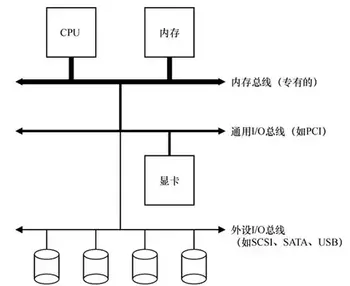 先介绍下系统的IO原型架构。CPU 通过内存总线(memory bus)连接到系统内存。显卡或者其他高性能 I/O 设备通过常规的I/O 总线(I/O bus)连接到系统,在许多现代系统中会是 PCI 或它的衍生形式。最后,更下面是外围总线(peripheral bus),比如 SCSI、SATA 或者 USB。它们将最慢的设备连接到系统,包括磁盘、鼠标及其他类似设备。