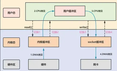 首先,期间共发生了 4 次用户态与内核态的上下文切换,因为发生了两次系统调用,一次是 read() ,一次是 write(),每次系统调用都得先从用户态切换到内核态,等内核完成任务后,再从内核态切换回用户态。上下文切换到成本并不小,一次切换需要耗时几十纳秒到几微秒,虽然时间看上去很短,但是在高并发的场景下,这类时间容易被累积和放大,从而影响系统的性能。