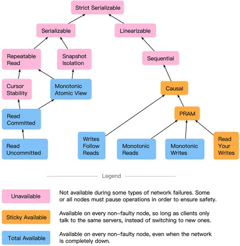 CAP定理说我们不能构建完全可用的线性化系统。有其他证明告诉我们,你不能构建具有顺序、可序列化、可重复读取、快照隔离或游标稳定性的完全可用系统——或者任何比这些更强的模型。在Peter Bailis的高可用事务论文中^[Highly Available Transactions: Virtues and Limitations]的这张地图中,红色阴影的模型不可能完全可用。