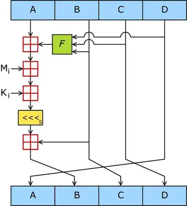 a = b + ((a + F(b,c,d) + X[k] + T[i]) <<< s). */
