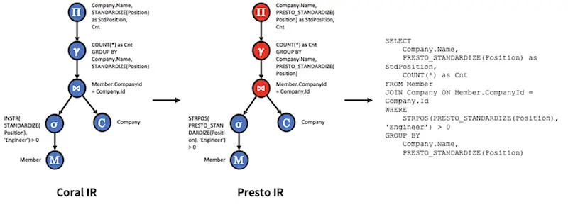 下面以Presto为例,展示了从Coral IR 到 Presto SQL 的 Coral Presto 转换过程。