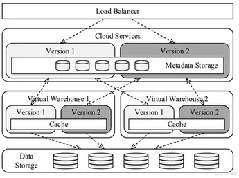 图3显示了正在进行的升级过程的快照。有两个版本的Snowflake运行并排,版本1(亮)和版本2(暗)。云服务有两个版本,控制两个虚拟仓库(vw),每个都有两个版本。负载平衡器将传入的请求定向到云服务的适当版本。一个版本的云服务只与一个匹配版本的通信。