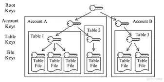 在帐户秘钥和表秘钥之间以及根秘钥和帐户秘钥之间实现了类似的方案。秘钥层次的每一级都会经历key rotation和rekeying,包括根秘钥。帐户密钥和根密钥的key rotation和rekeying不需要对文件进行重新加密。只需要重新加密较低级别的密钥。