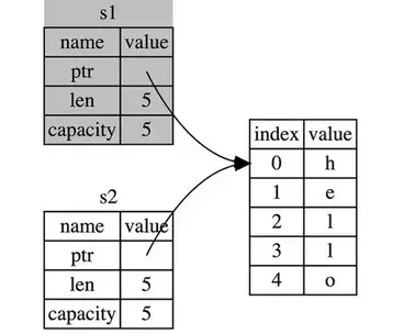 let s2 = s1;String 类型是一个复杂类型,由存储在栈中的堆指针、字符串长度、字符串容量共同组成。堆指针指向了一个堆上的空间,这里存储着它的真实数据。