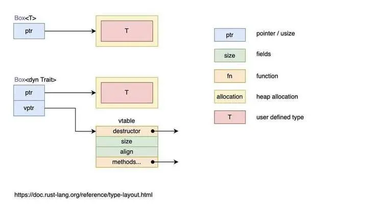 - 另一个指针 vptr 指向一个虚表 vtable,vtable 中保存了类型 Button 或类型 SelectBox 的实例对于可以调用的实现于特征 Draw 的方法。当调用方法时,直接从 vtable 中找到方法并调用。